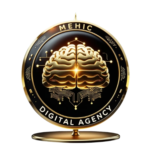 Zlatni AI logo Mehic Digital Agency sa sjajnim mozgom – simbol inovacije i digitalne inteligencije
